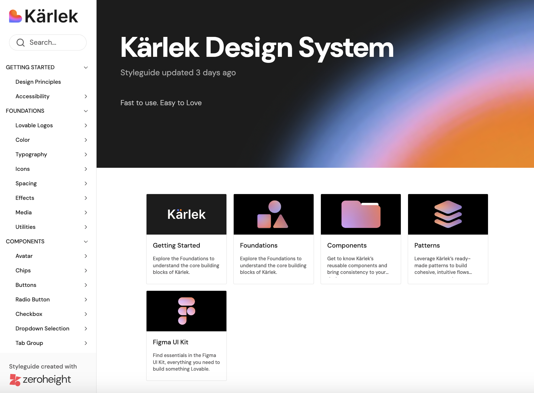 Find out more about the Kärlek design system on Zeroheight and Figma Community.